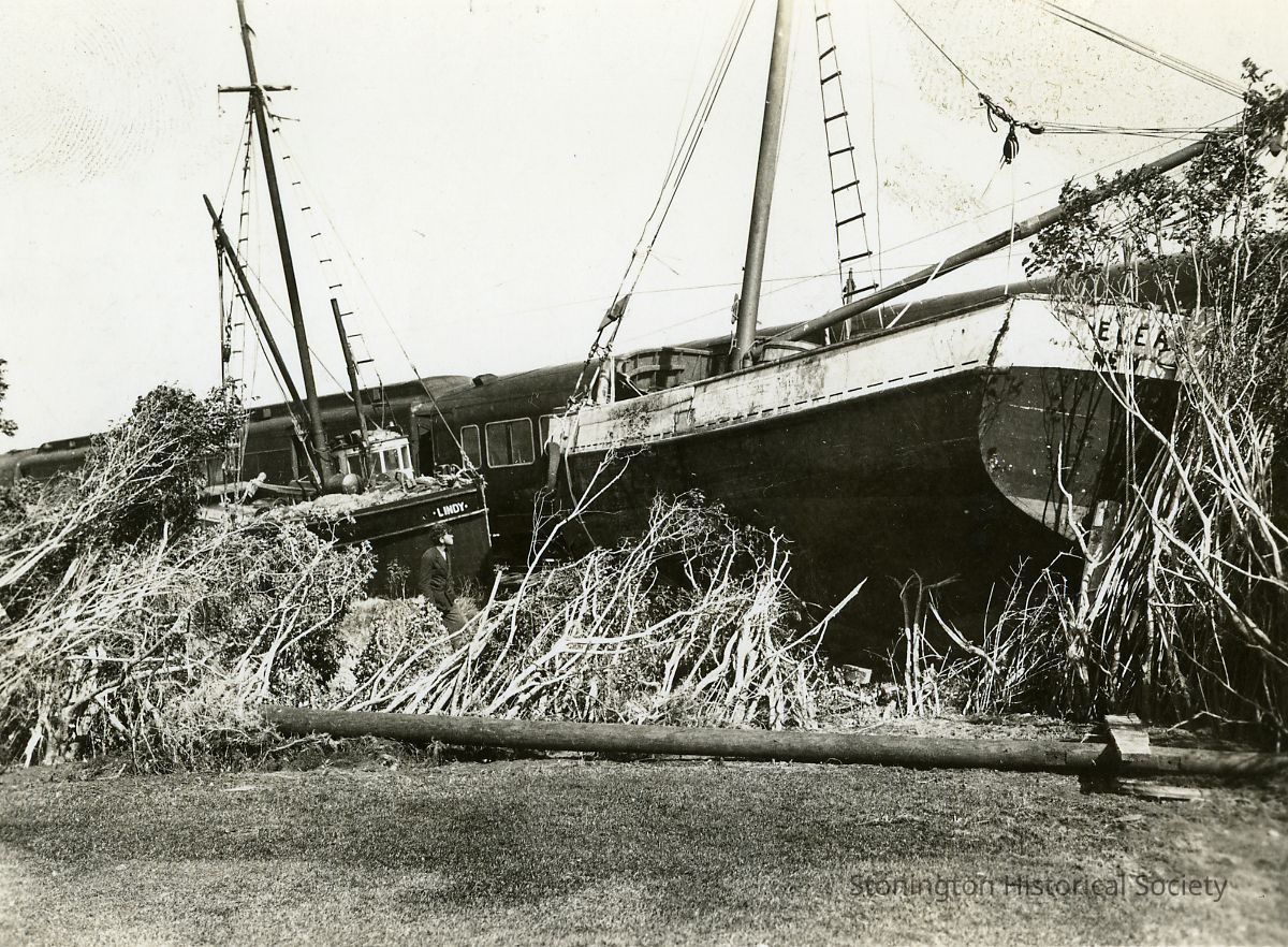 Fishing boats washed against derailed train on causeway; one boat is the LINDY