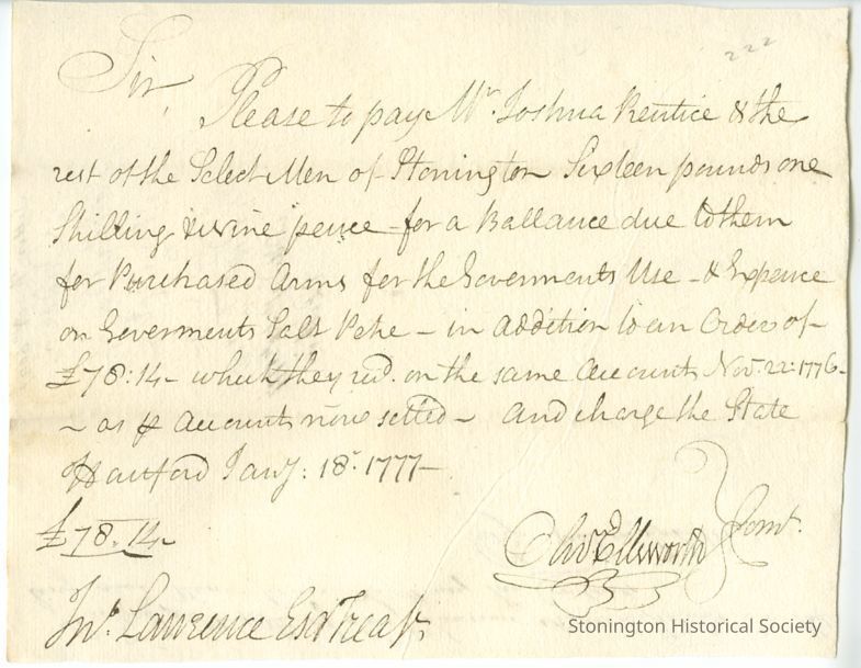 Order to the State Treasurer to pay "Mr. Joshua Prentice & the rest of the Select Men of Stonington Sixteen pounds one Shilling & nine pence for a balance due to them for Purchased Arms for the Governments Use & expence [sic] on Governments Salt Petre...."