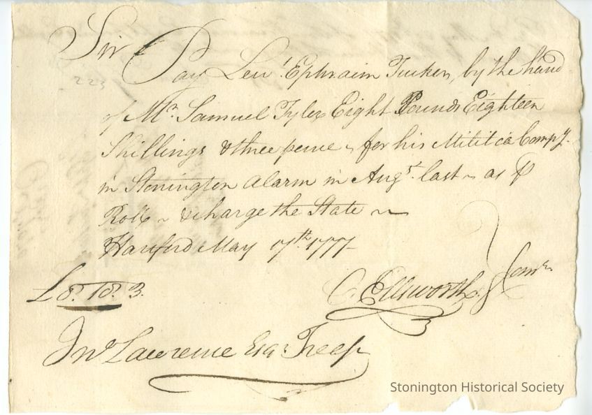 Order to State Treasurer to pay "Lieu't Ephraim Tucker by the hand of Rabban. Samuel Tyler Eight Pounds Eighteen Shillings & three pence for his Militia Company in Stonington Alarm in Aug't last..."
