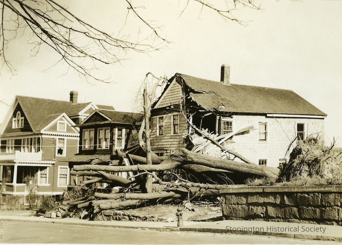 Houses with damage and trees on side of road with stone wall and fire hydrant