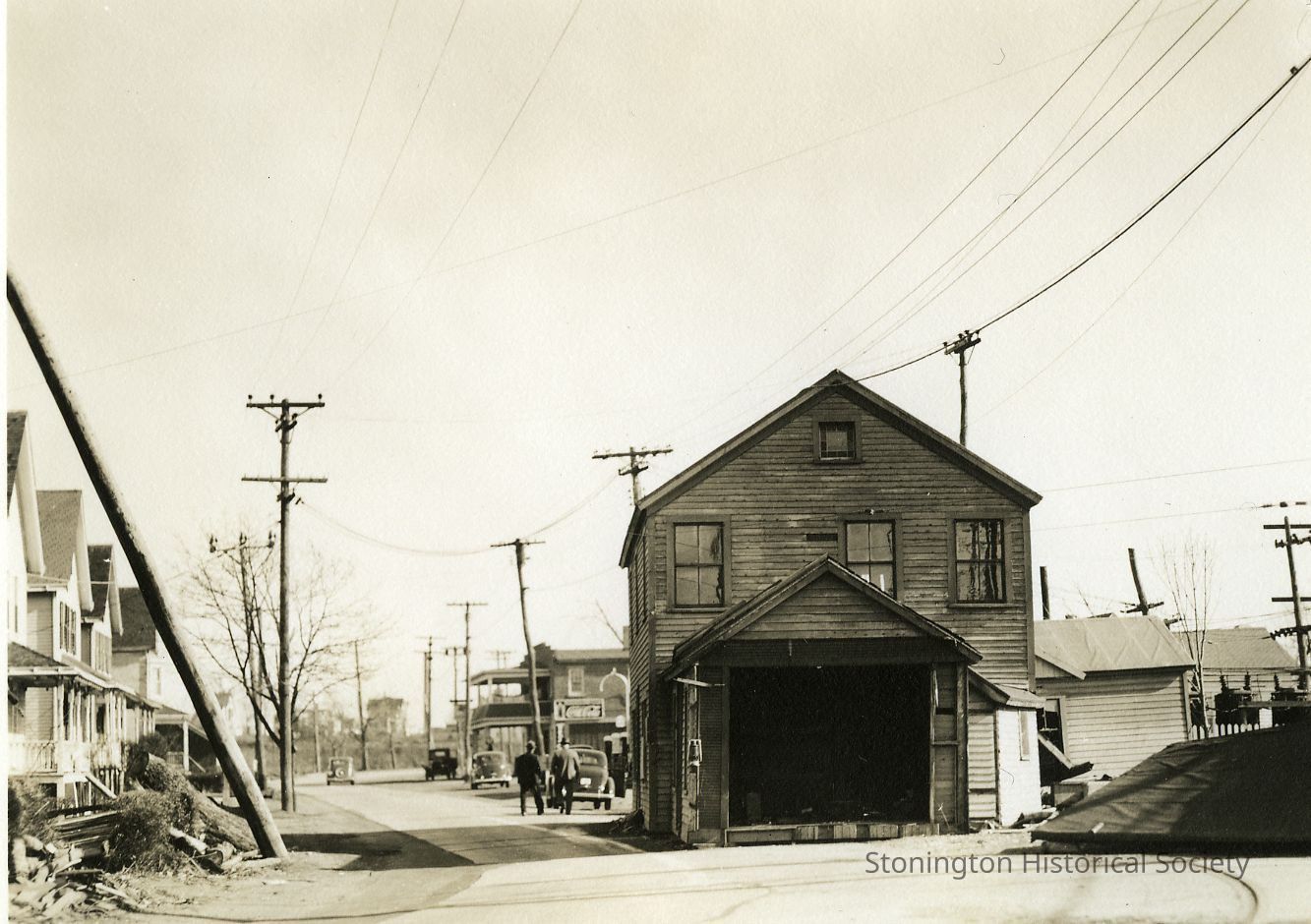 Damaged houses and utility poles on road with people and automobiles. Building in middle background has a Coca-Cola sign; large h ouse in distanceCollection