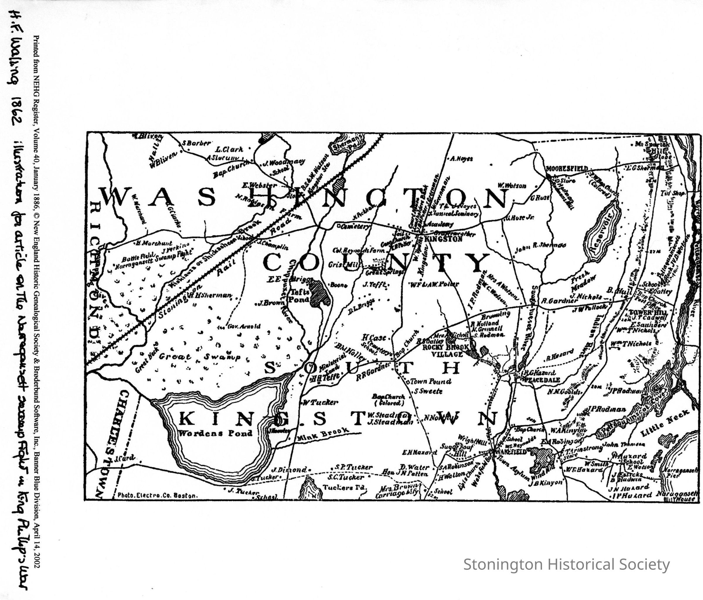 Photocopy of map of part of Washington County, RI. Used as an illustration for article on the Narragansett Swamp Finght in King Philip's War.