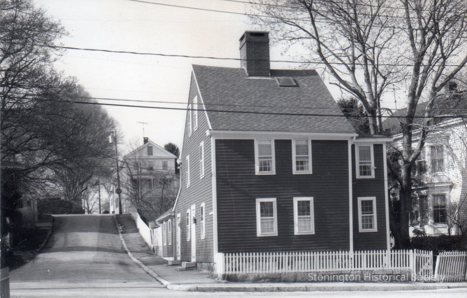 Black and white photograph postcard, intersection of Cliff and High Street (view of 17 Cliff Street). Photograph by Maurice LaGrua.Collection