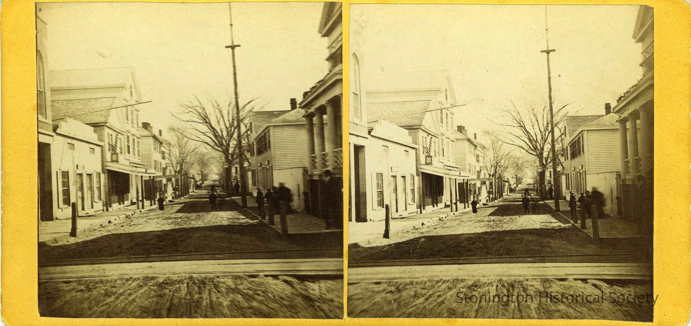 Stereo photograph of view of Water Street, Stonington looking south towards Point. Note train tracks crossing Water Street, going to Round House and docks. Crossing was about where 147 is today.