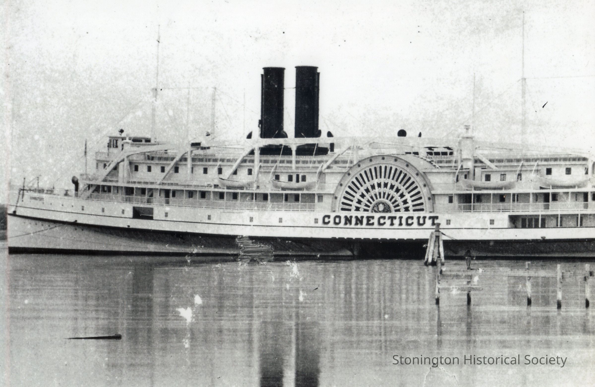 Cyanotype with black and white enlargement, photograph of the passenger paddle wheel steamer CONNECTICUT, owned by the Providence & Stonington Steamship Co. Given to the Society by Harry Northup before his death. With note: "A view of the CONNECTCIUT, another Stonington steamer. Notice she had twin stacks. The Hog frames are quite evident in the picture. From reports that I have read, it was said this vessel was rather cranky to operate. I don't know if it was engine trouble or handling in a seaway. But all told it was a very handsome vessel."Collection