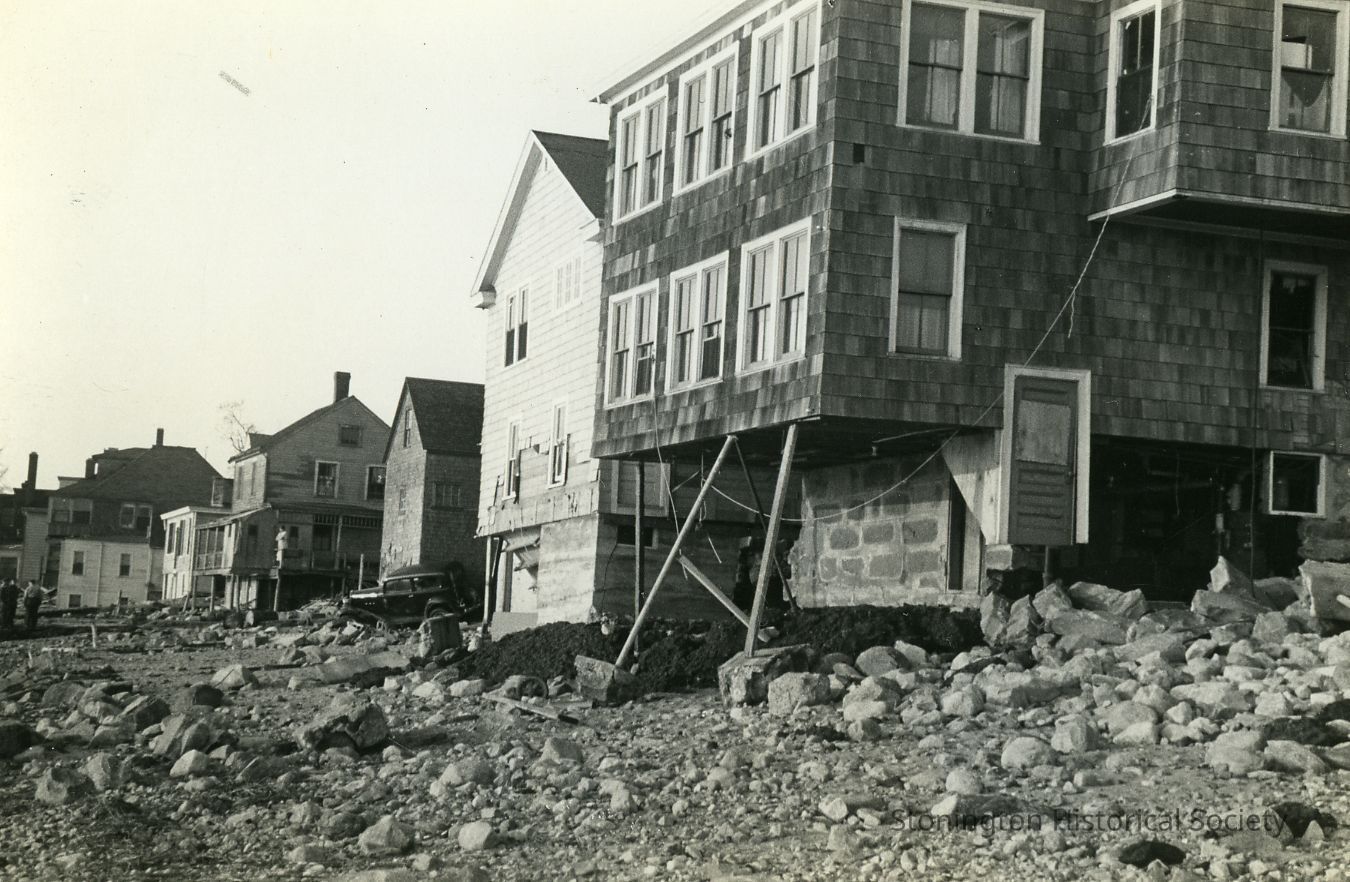 Damaged houses with washed away foundations being propped up with wood beams. An automobile is in the background