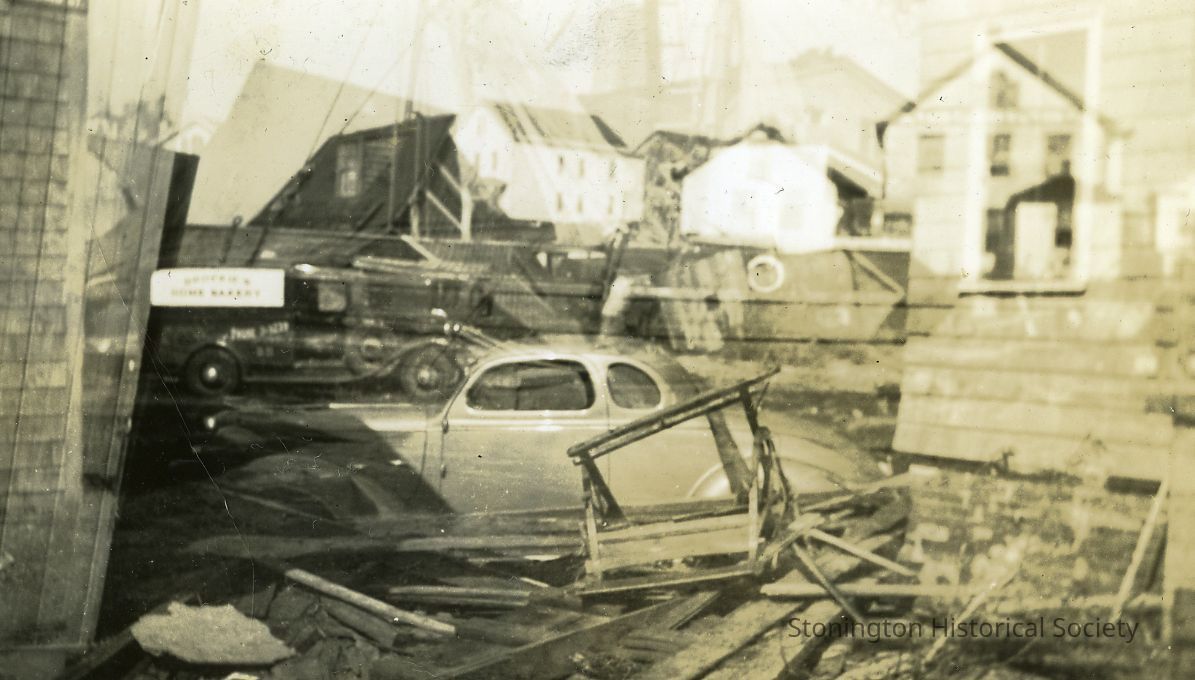 Wrecked automobiles in debris with damaged houses. Photo might be a double exposure