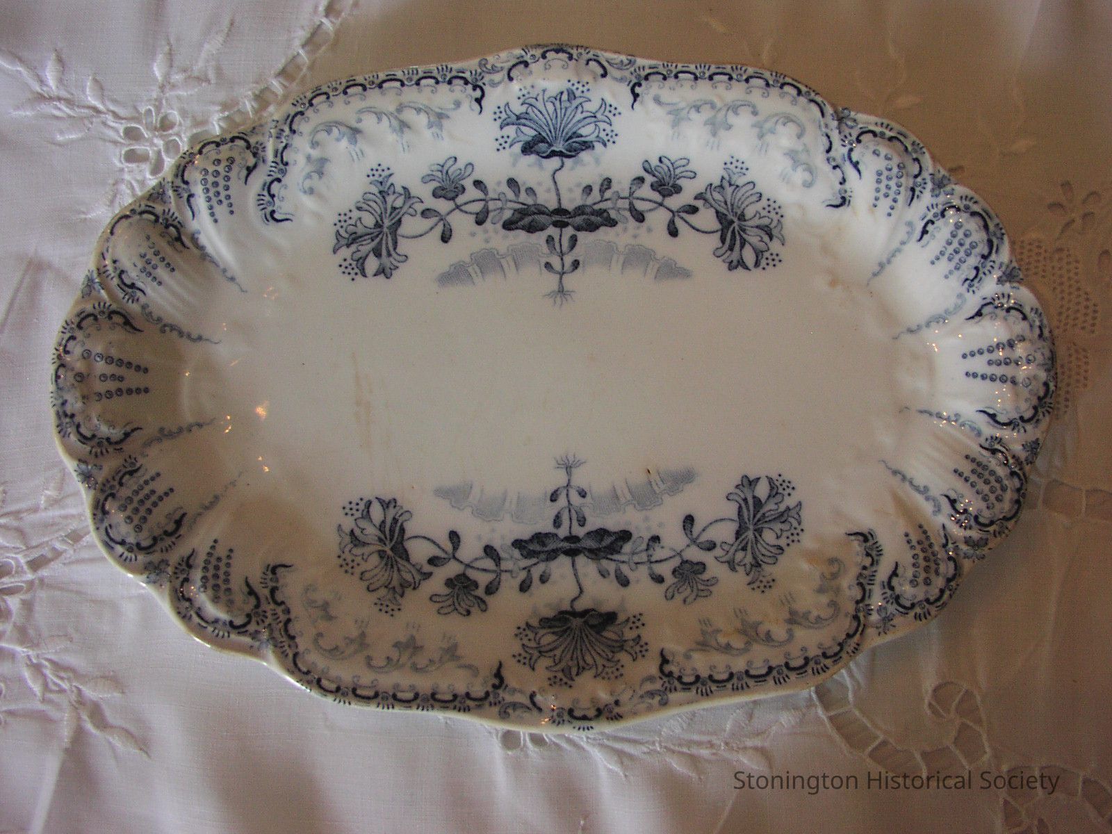 Blue and white platter with design of two sets of flowers tied together with a bow--each bunch consists of five flowers. The design bordering the plate consist of swirls and rows of polka-dots. The bottom is marked "St. Amand et Hamage Nord Regence" and is stamped "terr de fer."Collection