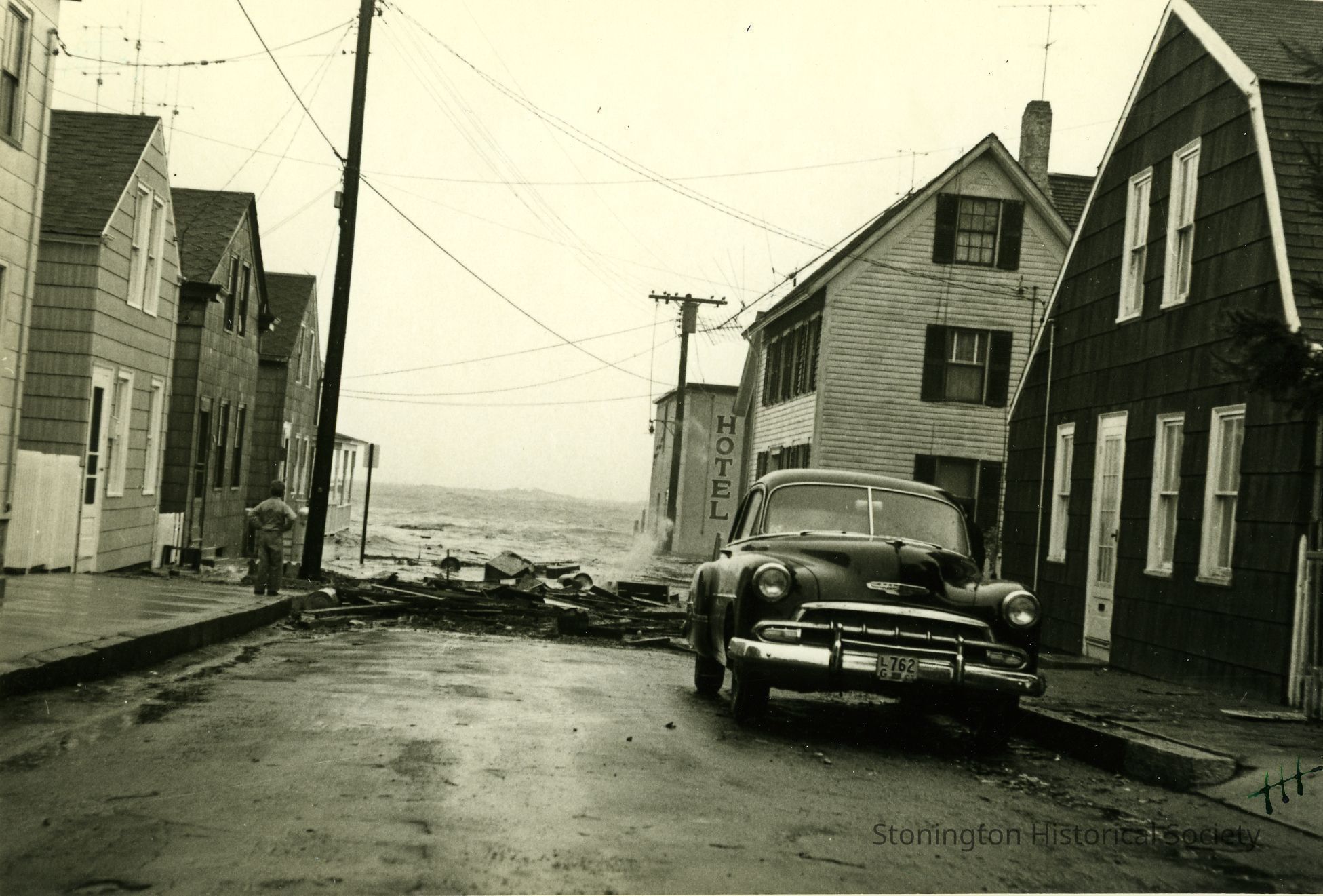 Automobile parked outside house on Diving Street with person looking at damage towards Little Narragansett Bay; Hotel on right in background