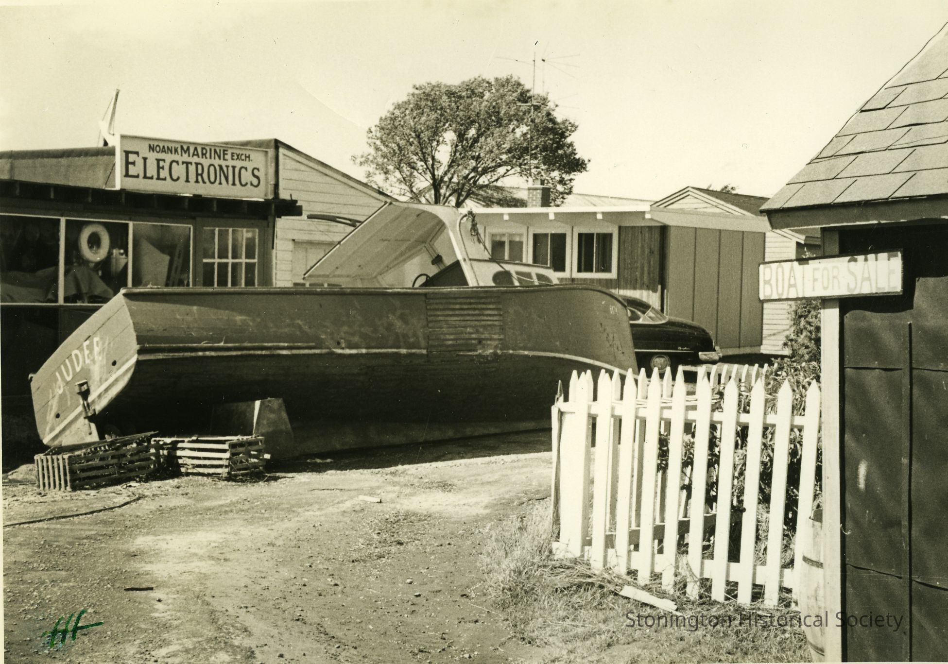 Power boat JUDEP(?) washed up in front of Noank Marine Exch. Electronics with lobster traps and picket fence; Boats for sale sign on building at rightCollection