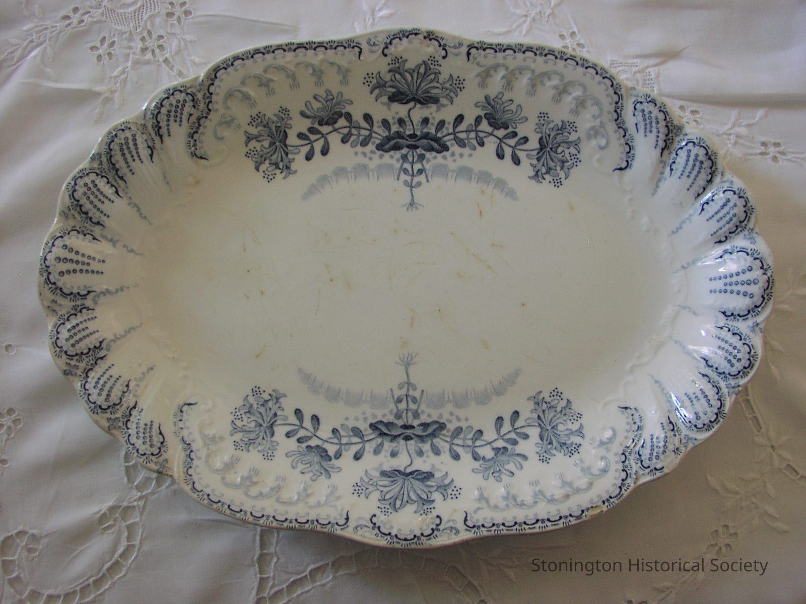 Blue and white platter with design of two sets of flowers tied together with a bow--each bunch consists of five flowers. The design bordering the plate consist of swirls and rows of polka-dots. The bottom is marked "St. Amand et Hamage Nord Regence" and is stamped "terr de fer."Collection