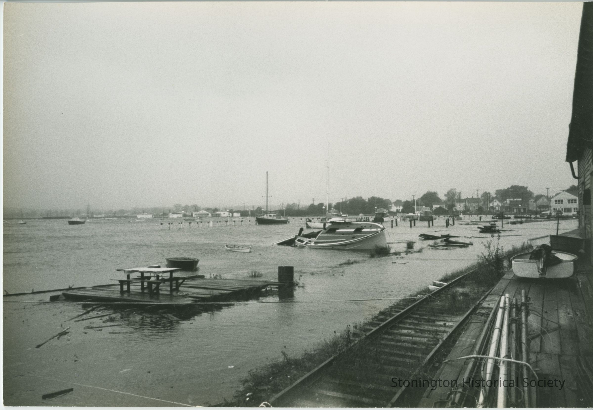 Boats, some sunk, in harbor near railroad tracks at bottom of Broad Street; floating dock with picnic table; Wadawanuck Club in backgroundCollection