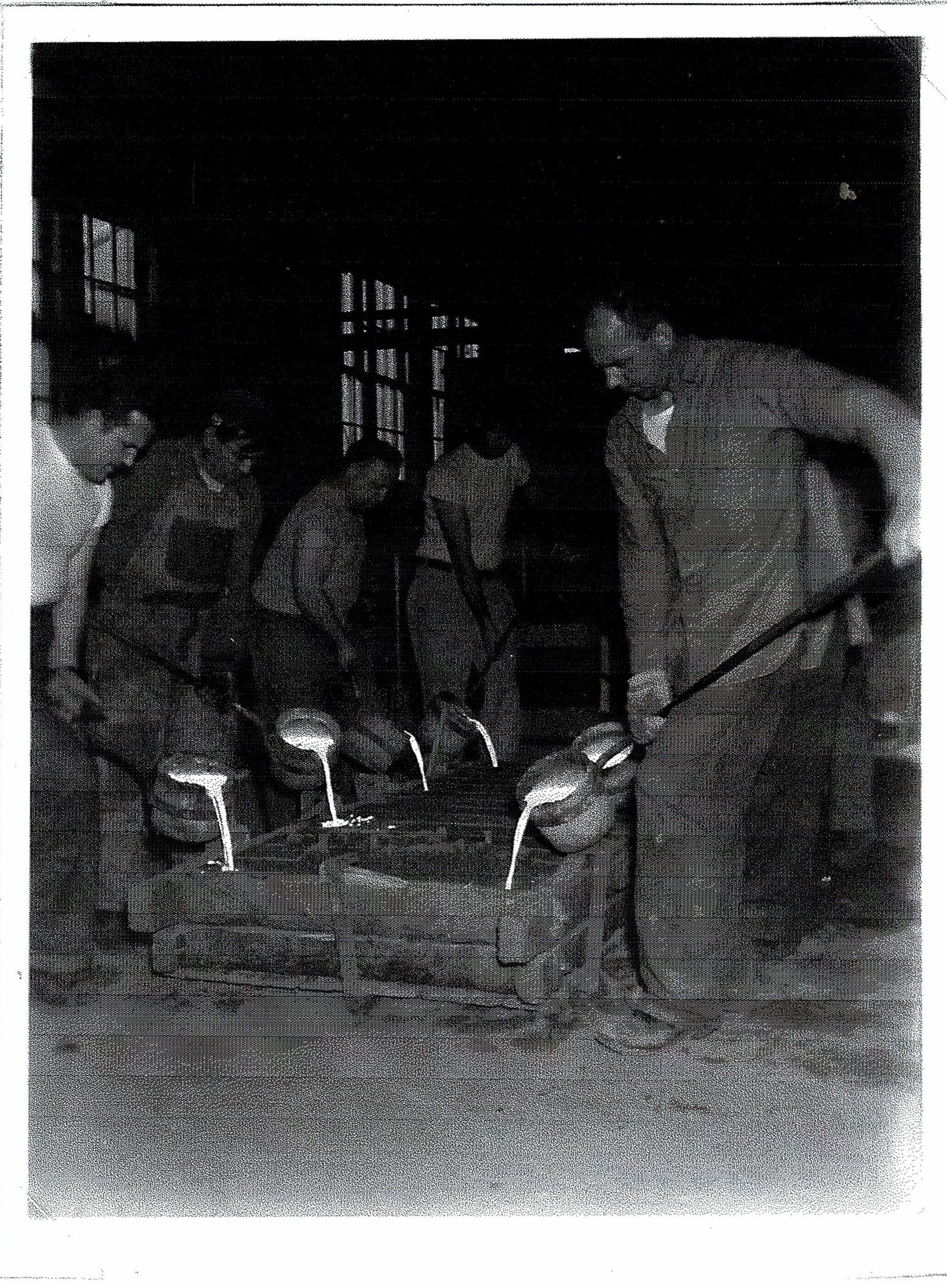 Group of men pouring molten metal into molds at the Atwood Machine Company during the 1940s.