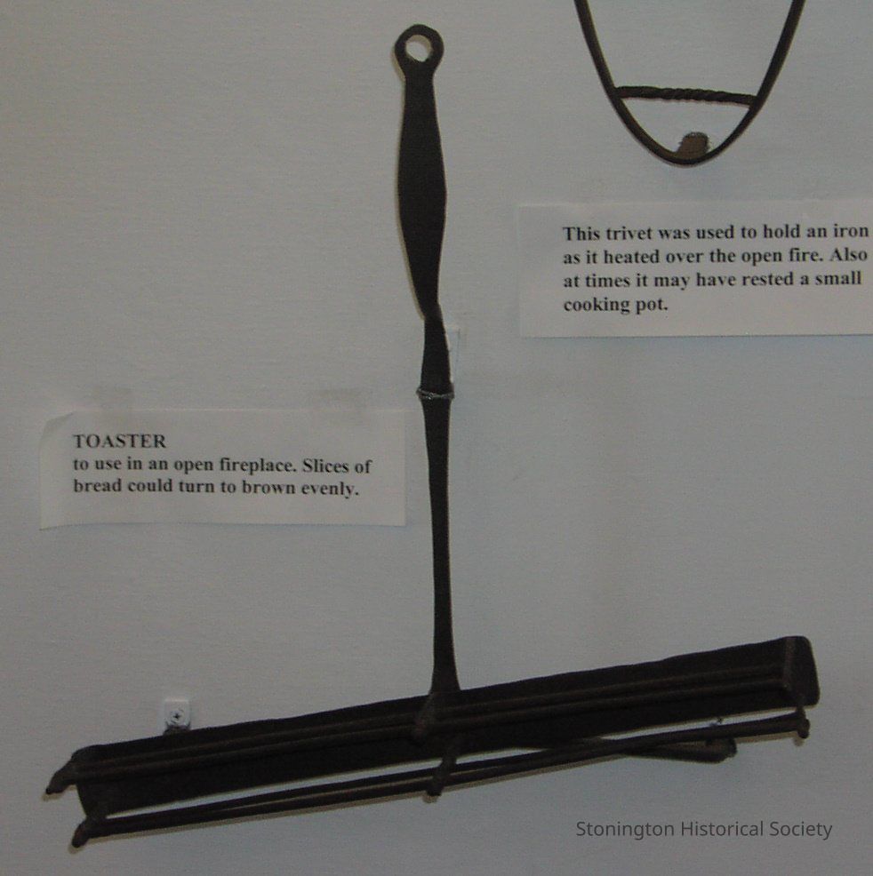 iron fireplace toaster with revolving clamp. This is one of a variety of wrought iron grids or clamps used to toast bread over a fire. Usually these toasters had long handles and small wire fences which held several slices of bread. They could be turned easily with a flick of the wrist to toast both sides.Collection