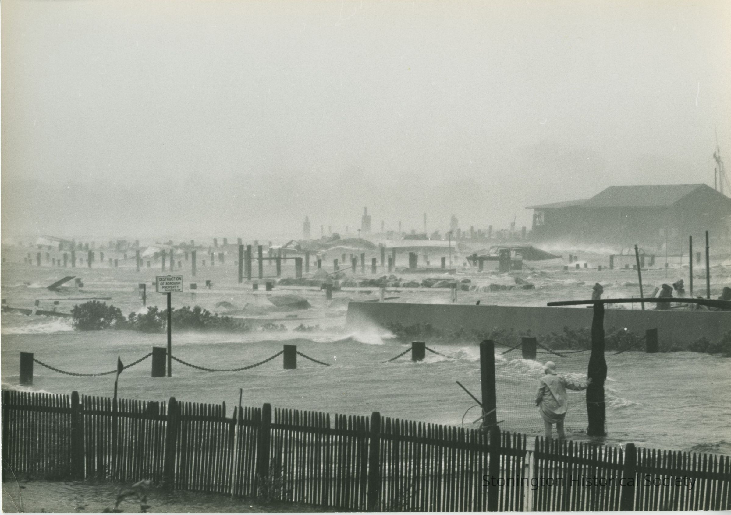 Person standing in water at Wayland's Wharf with docks, debris, and wrecked boats in background