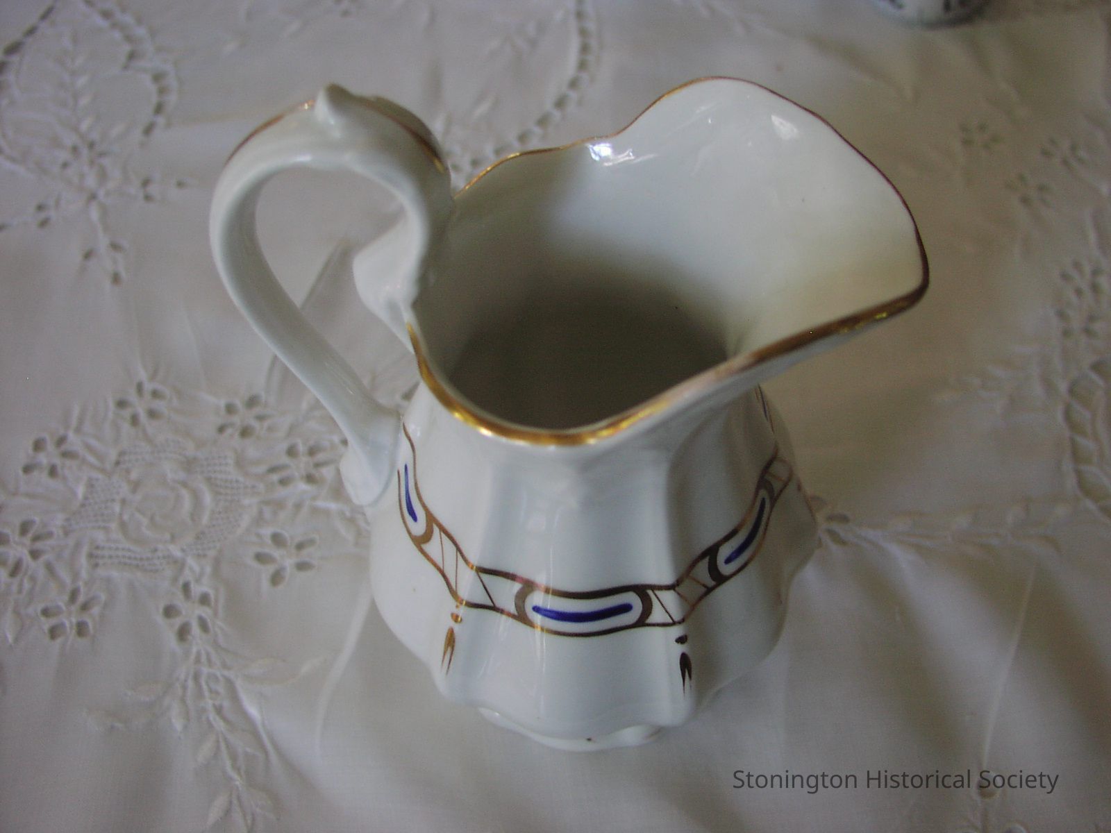 White cream pitcher with pattern of gold luster and blue stripes.