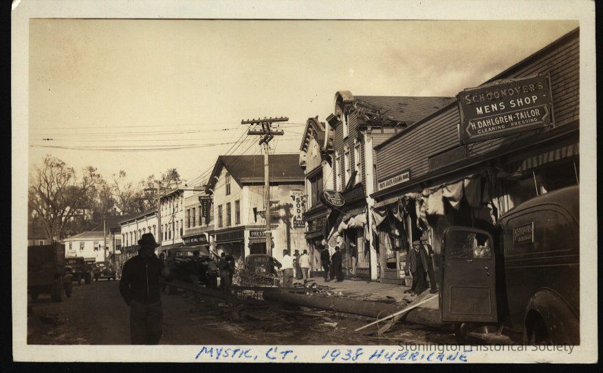 Main Street in Mystic after hurricane of 1938 showing damaged buildings, automobiles, debris and people walking in front of shops