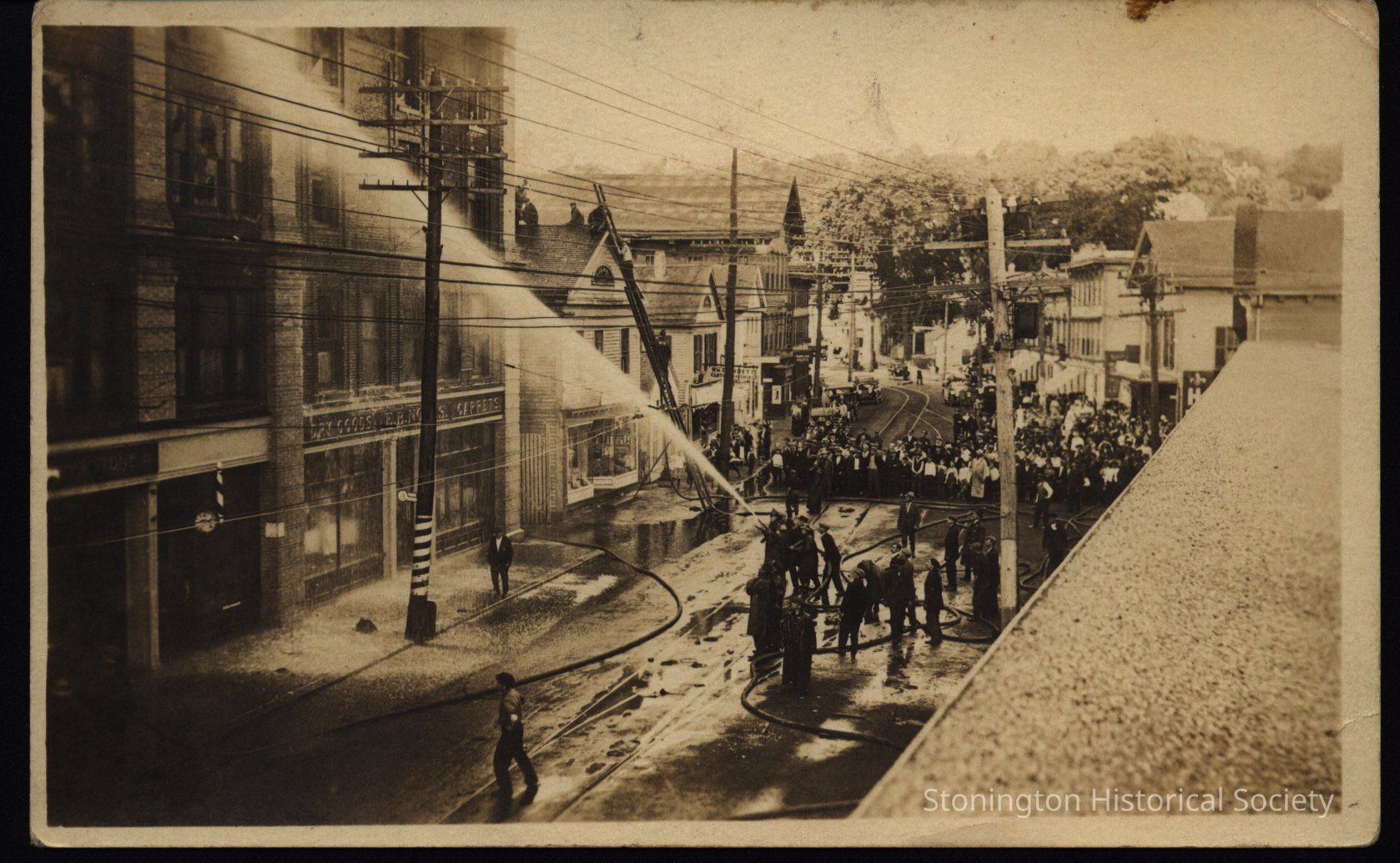 Groton side of Main Street in Mystic from drawbridge showing firemen working on fire at the Gilbert Block (now the Main Building) on West Main Street, June 1915.Made/Created