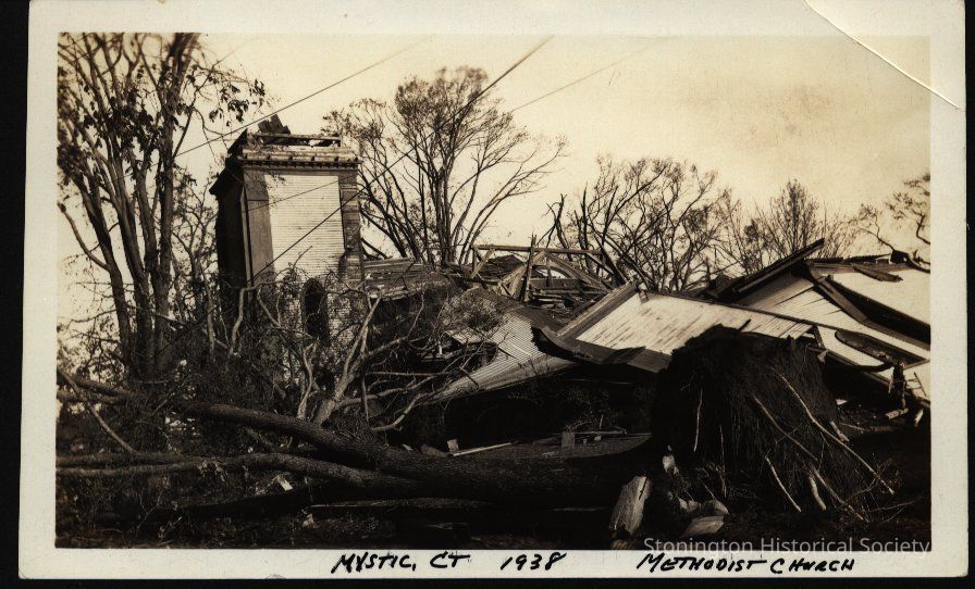 Badly damaged Methodist Church in Mystic after 1938 hurricane