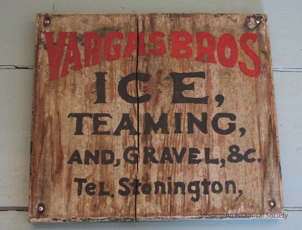 wooden "Vargas Bros; Ice, Teaming, And, Gravel, 8c.; Tel. Stonington" sign.