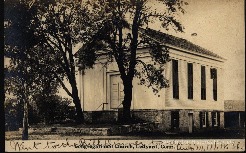Postcard of the Congregational Church in Ledyard CT sent to Mr. O. L. Holdridge in Riverpoint RI Aug. 30, 1906