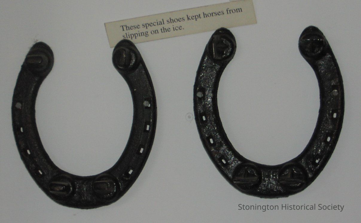 Pair of specialized iron horse shoes with cleats for walking on the ice (4 pointed rectangular spikes)