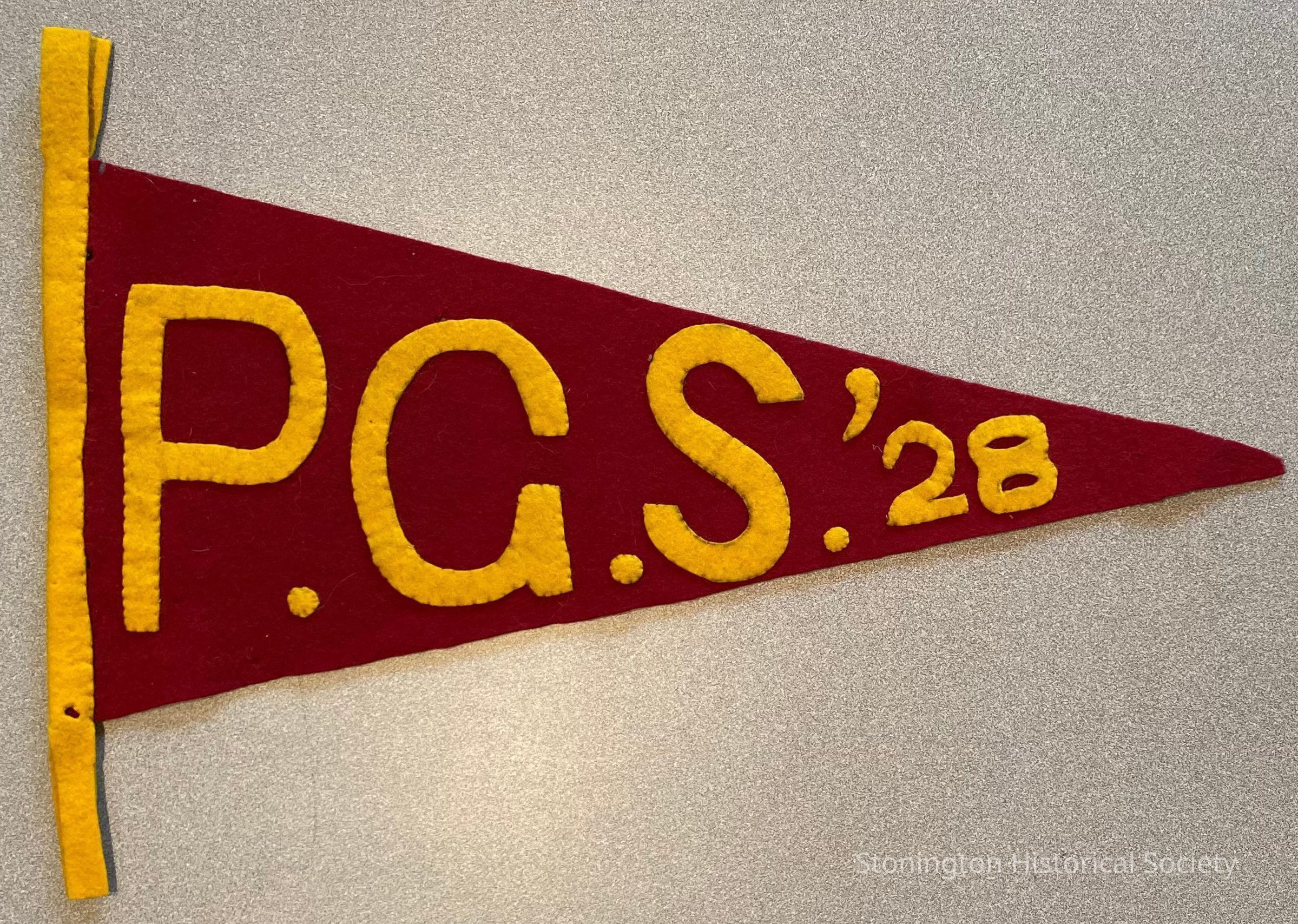 Red and yellow felt pennant, Pawcatuck Middle School class of 1928.
