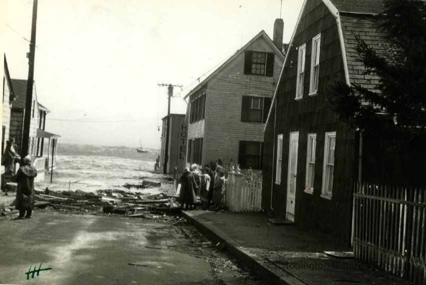 East end of Diving Street with "Hotel" on right side; people looking at damage