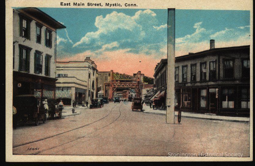 Postcard showing East Main Street in Mystic with trolley tracks and automobiles and drawbridge in background