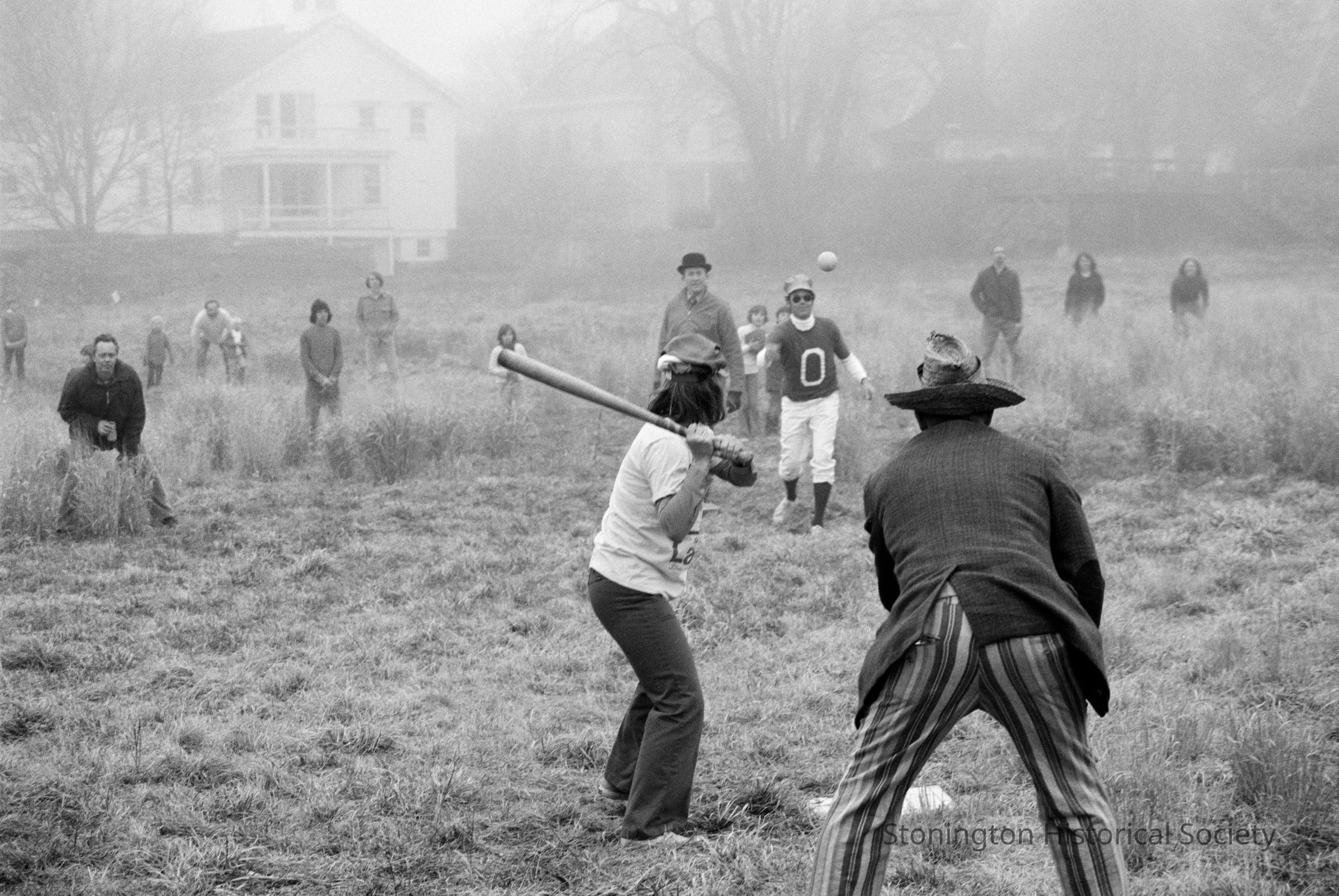 Black and white image depicts the annual Easter softball game in Dodge's paddock. Bill White is the shortstop, Charlie Davol is the umpire, Peter Freeman is the pitcher, Ann Freeman is at bat.Collection