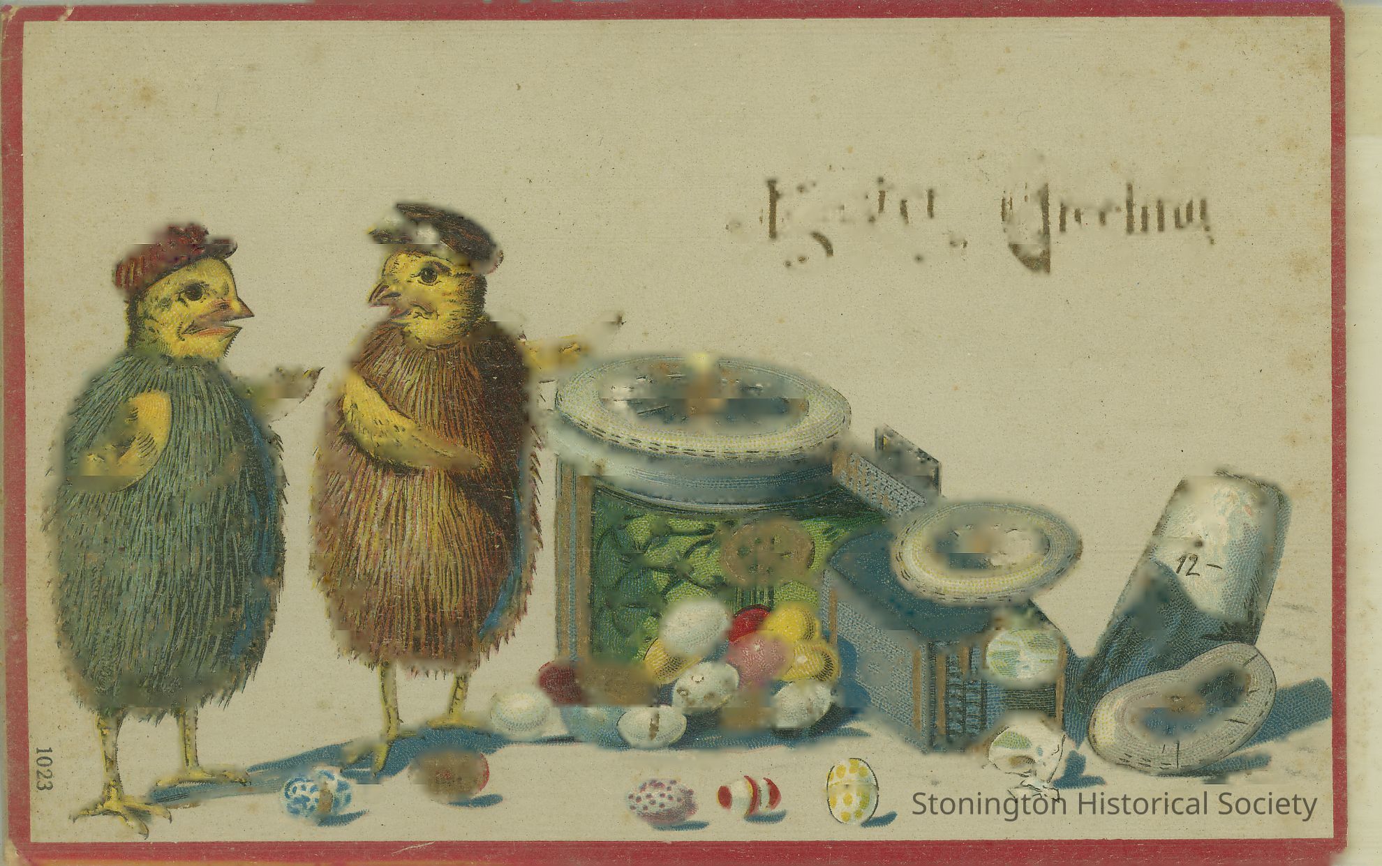 Two uniformed chicks, one a driver, with overturned vehicle with spilled easter eggs.