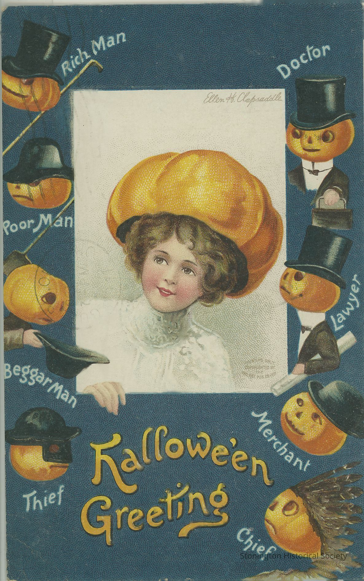 Young female wearing pumpkin hat surrounded by pumpkin men of different occupations.