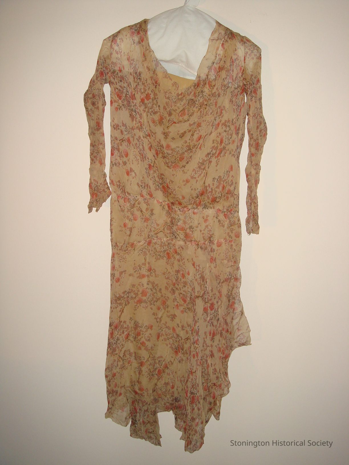 Beige chiffon dress with orange and brown floral pattern