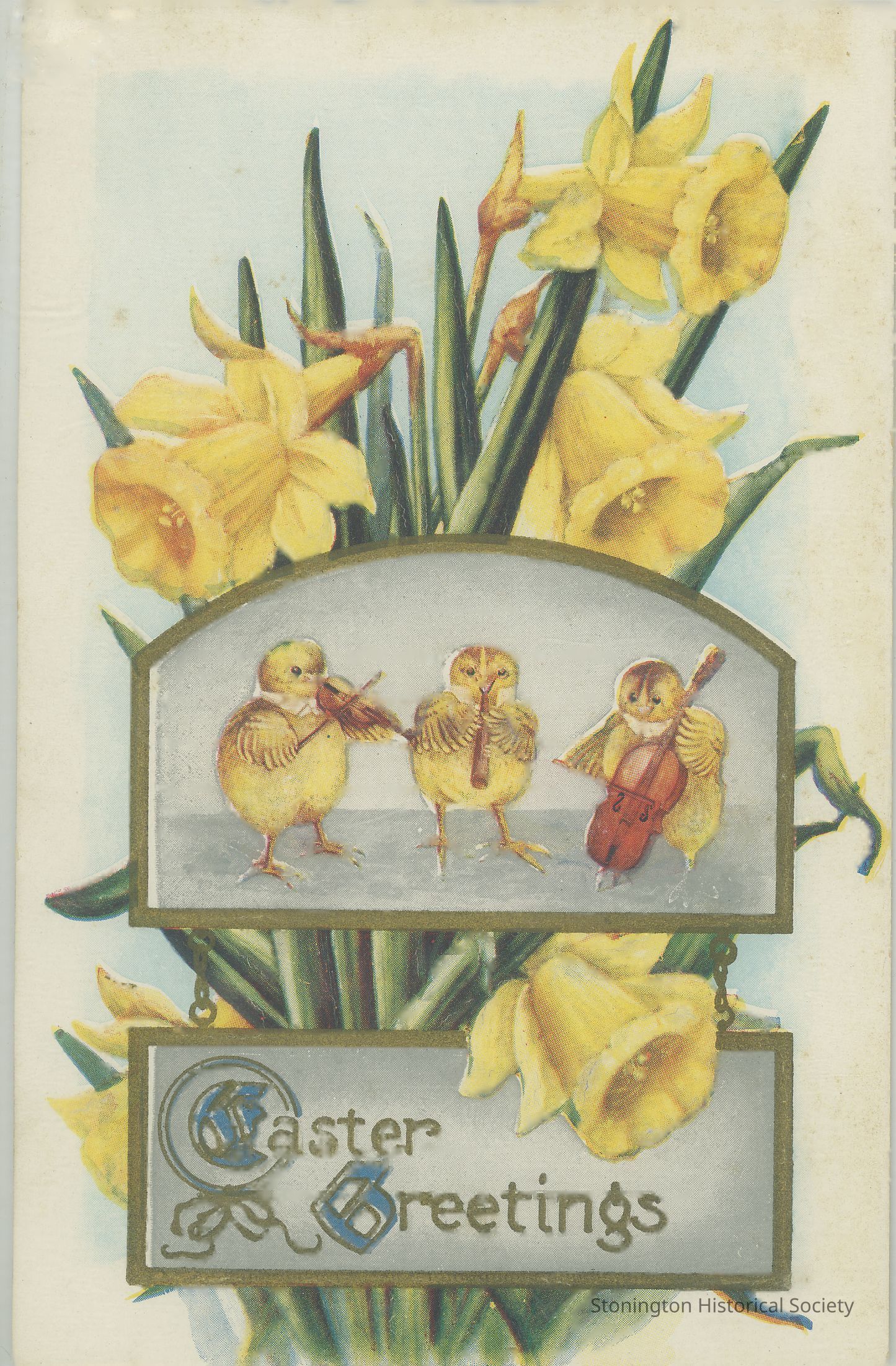 Three chicks playing a violin, an oboe, and a cello surrounded by daffodils Lightly embossed
