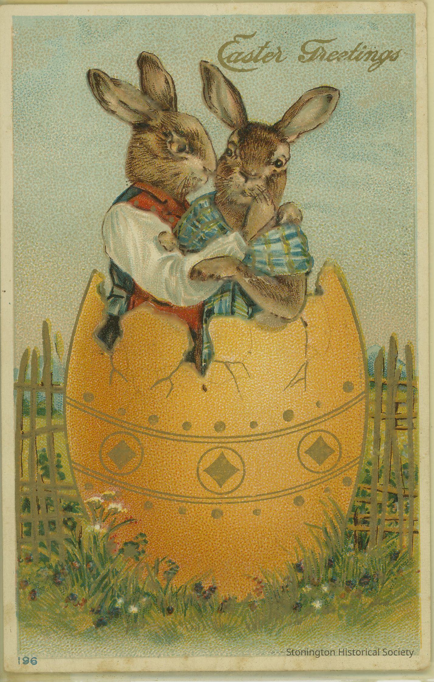 Two costumed rabbits in decorated egg shell 196?