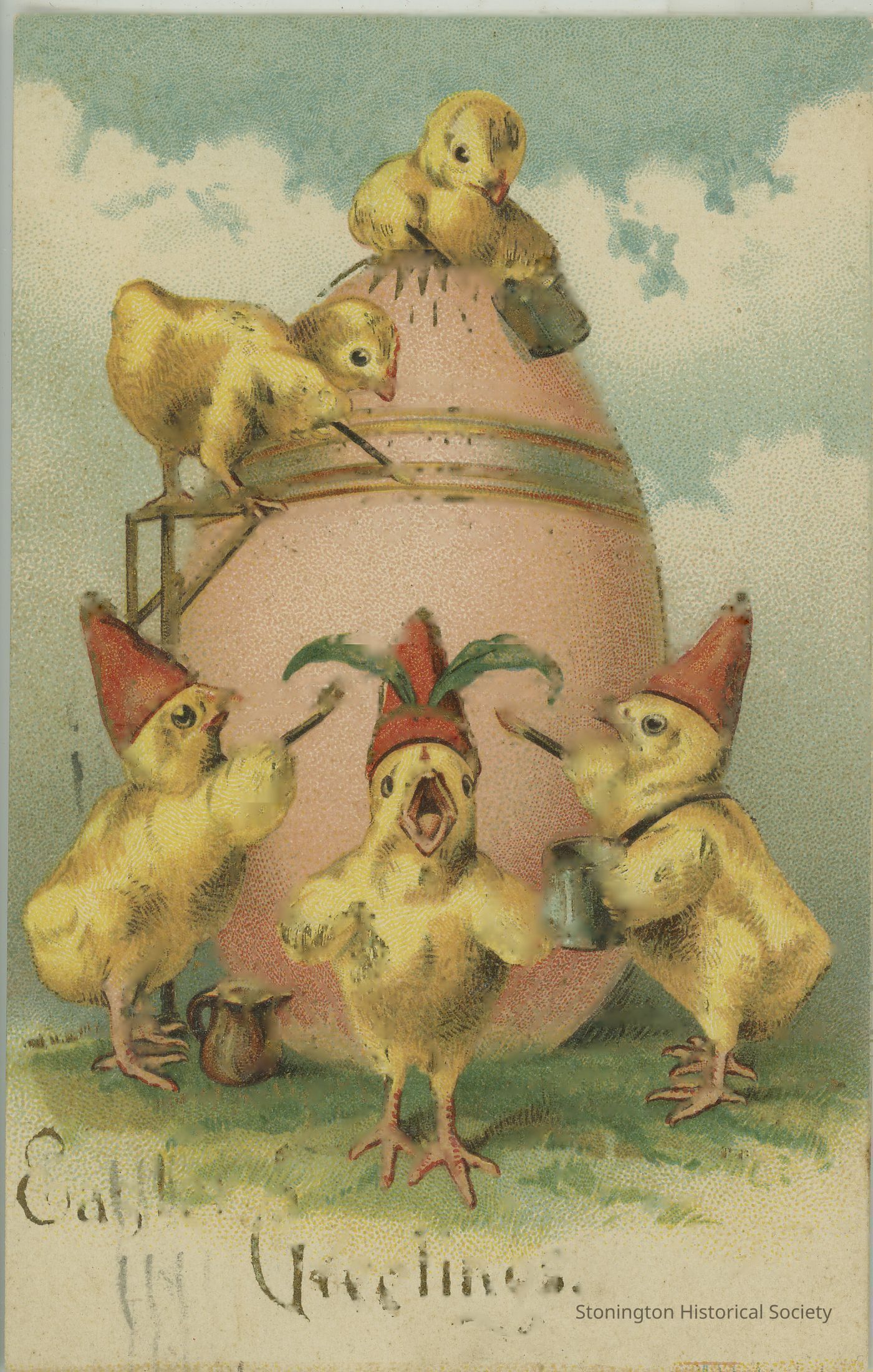 Five chicks around decorated egg. One singing, the rest painting decorations on egg.