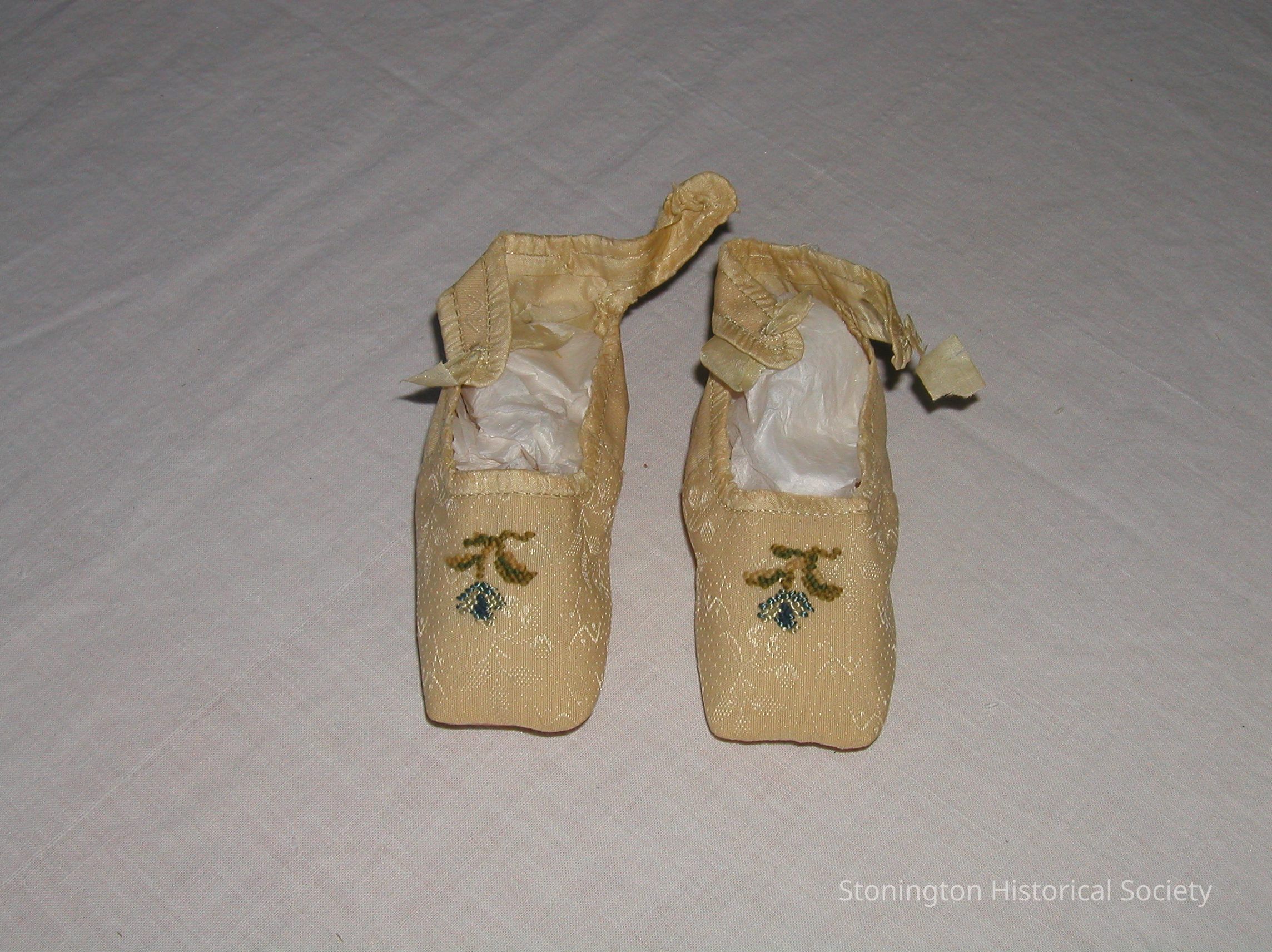 infant's silk and leather shoes leather soles, silk uppers wth blue flower embroidery machine stitched length 4 inches