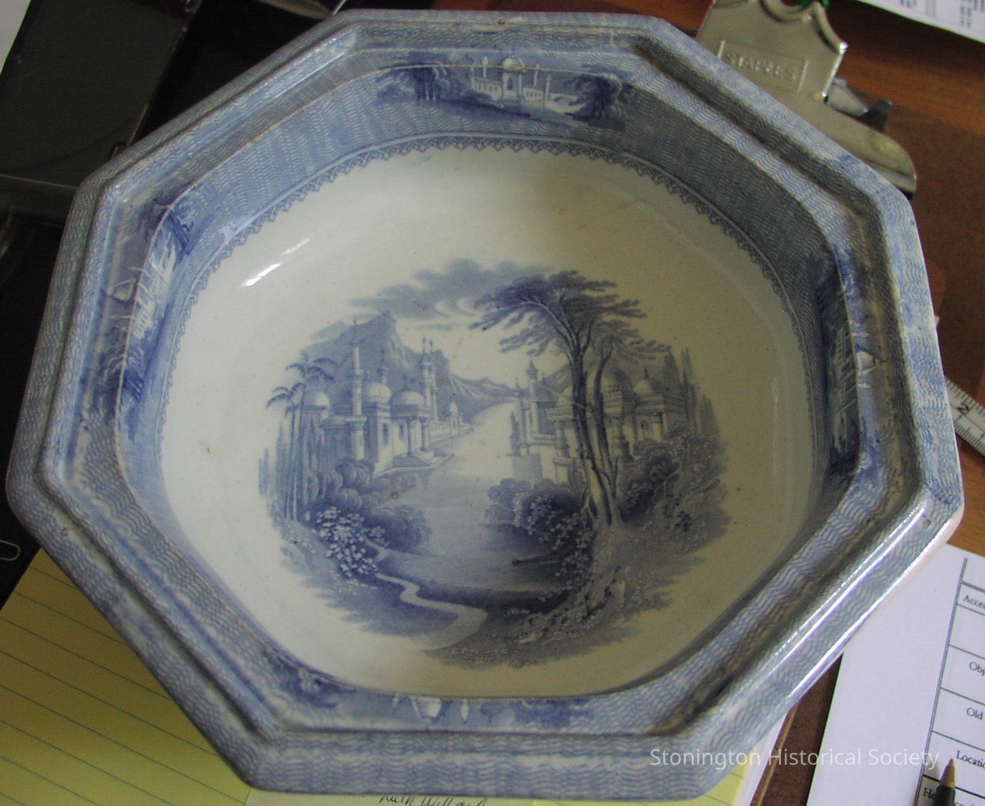 Slop bowl with blue and white transfer-ware pattern. Design features two Indian (?) style buildings across a river from each other. There is foliage in the foreground and mountains in the background. The outer edge and rim are decorated with wavy blue stripes and buildings.Collection