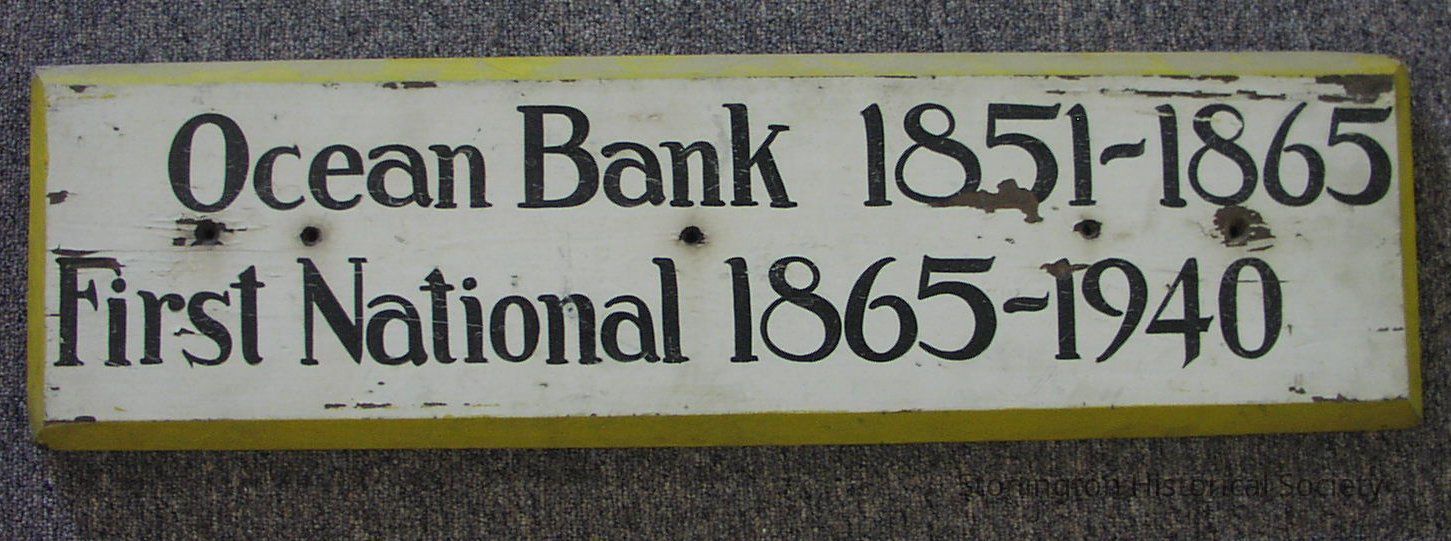 Plaque that states "Ocean Bank 1851-1865 First National 1865-1940" in Black on white background 5 hoes through board vertically across middle Edges painted yellow, cut at 45 degree angle
