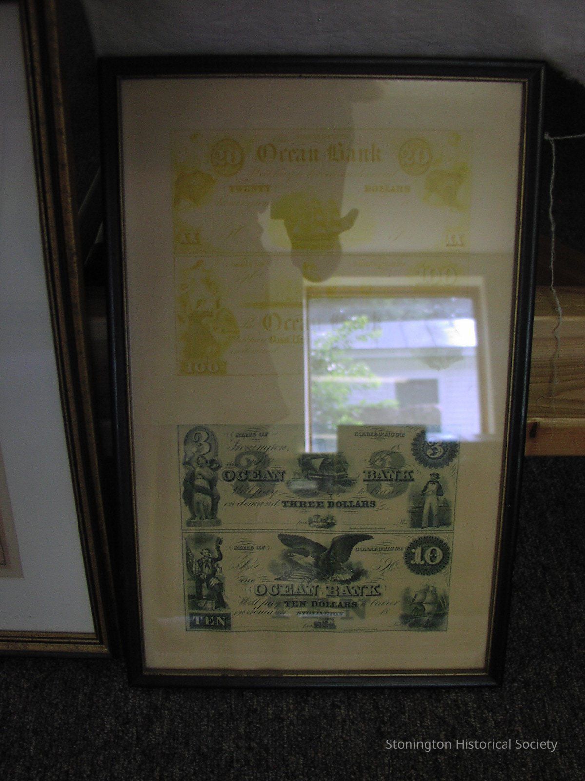 $100-image of multiple ships, full sail, going in dfferent directions,1 lady lower right corner, 3 ladies on left side, value and location