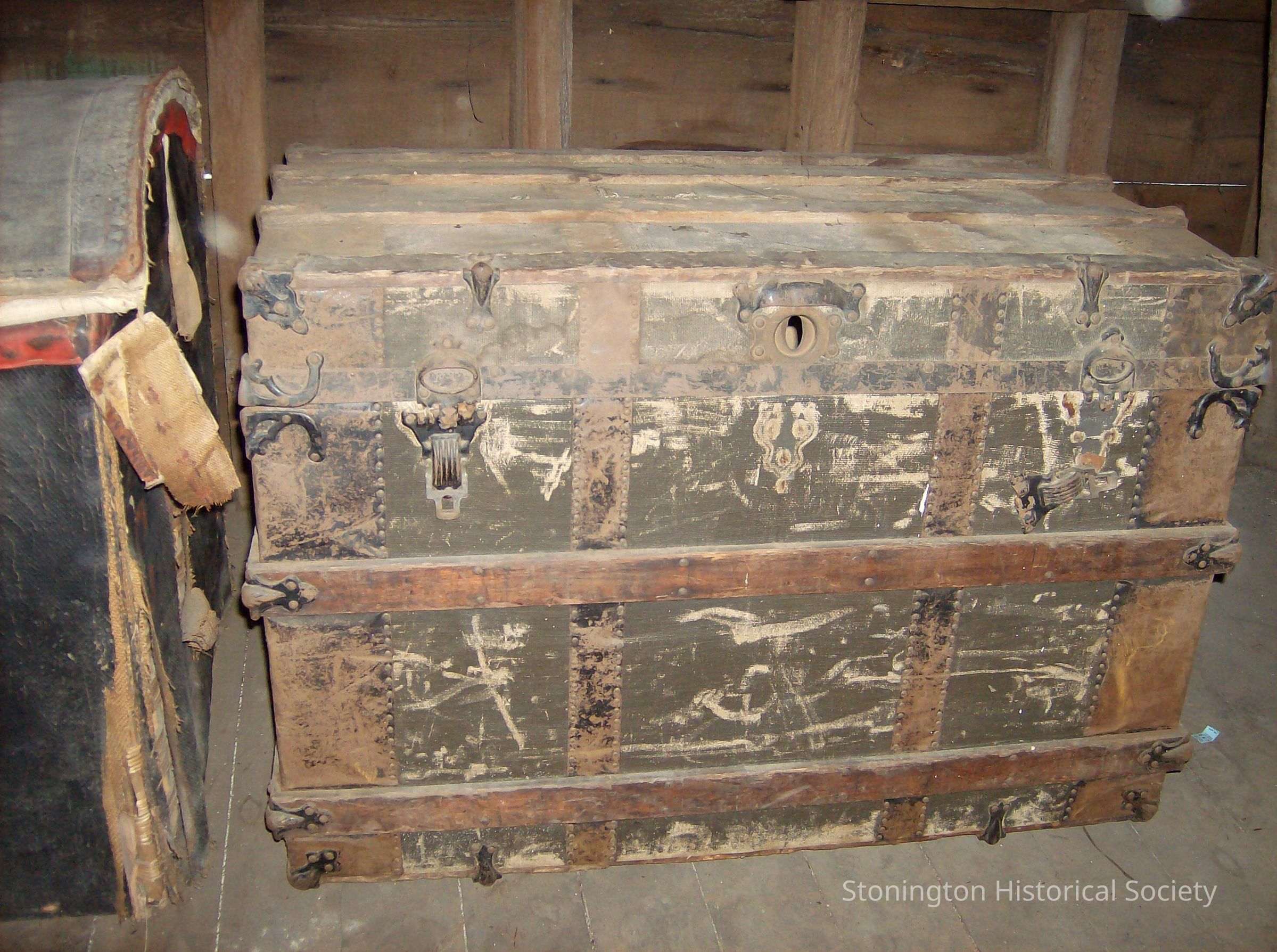 Large, flat, rectangular box shaped travel trunk, black with white marks all over Keyhole on front Wood strips horizontal on front, top of lid Vertical strips removed? Brackets on corners