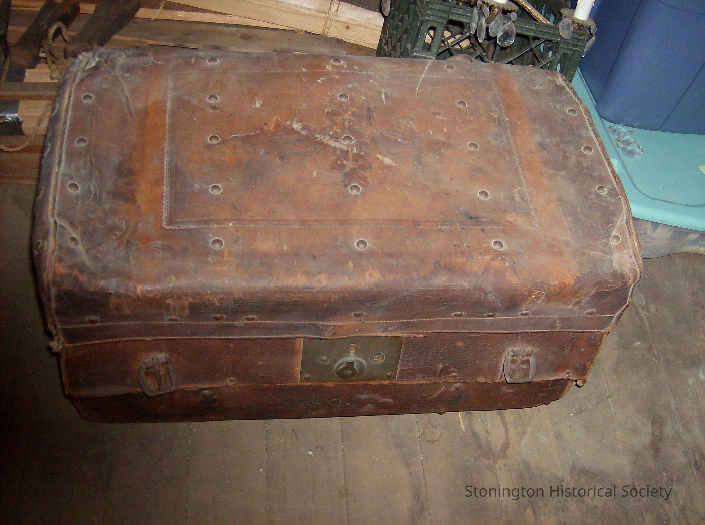 Wood frame travel trunk, covered with red/brown leather, embossed with scroll work symbols