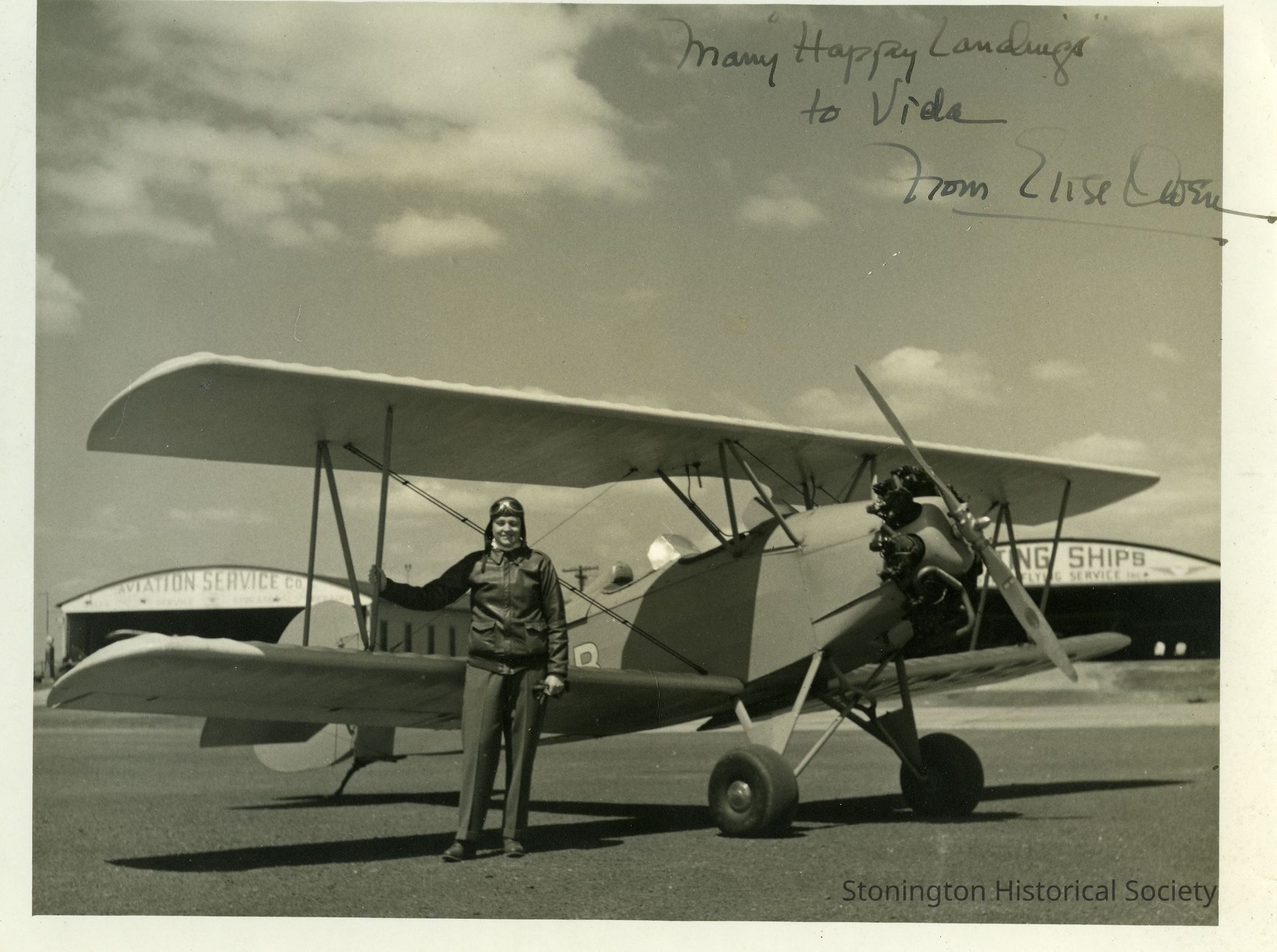 "Elise Own and 'Fleet' (took private flight test in this ship) on back