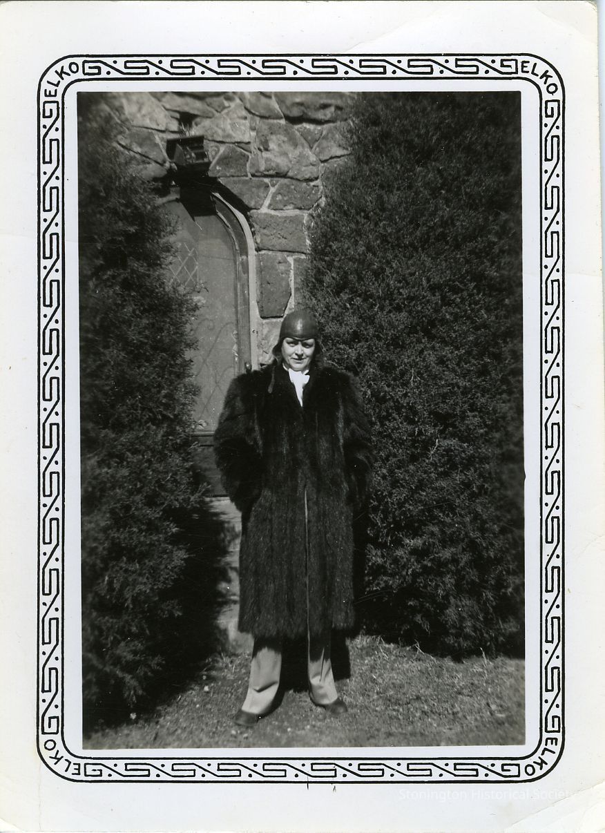 Black and white photograph of Elise Owen standing in front of stone building wearing fur coat(?)