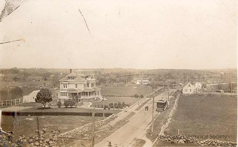 "Aerial" view of Elm Street looking east?north with "Bella Vista" on left. Note on back: Elm Street looking north from top of Jim Brown house (across from Town Hall); trolley line with E. Bradley's house "Bella Vista" at left center, Allen house in center distance. Brown owned meat market where LaGrua's Shop (shoe repair), Water Street.