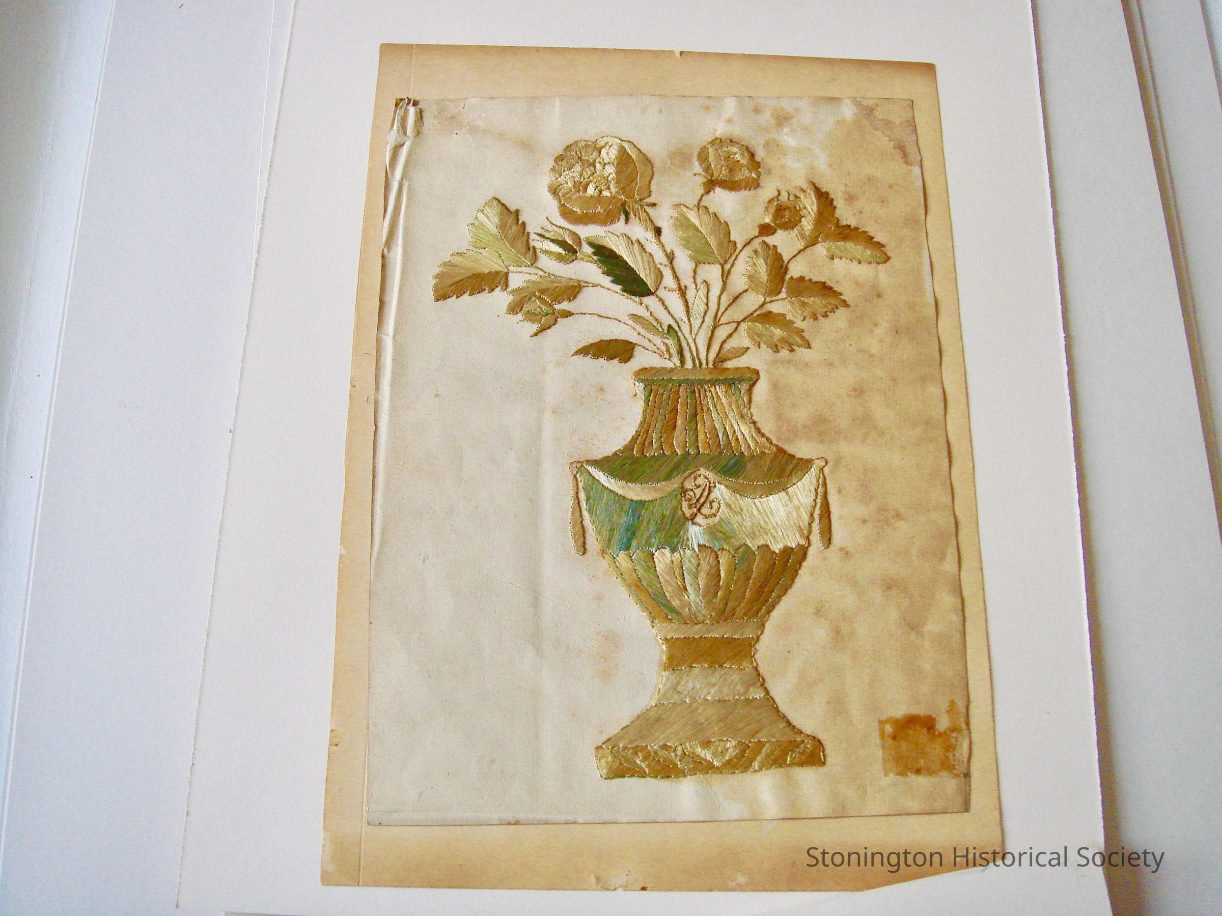 roses in urn, shades of gold and teal (green)