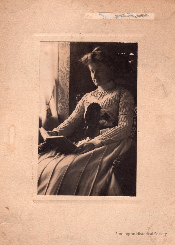 sepia photograph, mounted on board, portait of Emeline Palmer, "at Quonaduck, Stonington, CT"