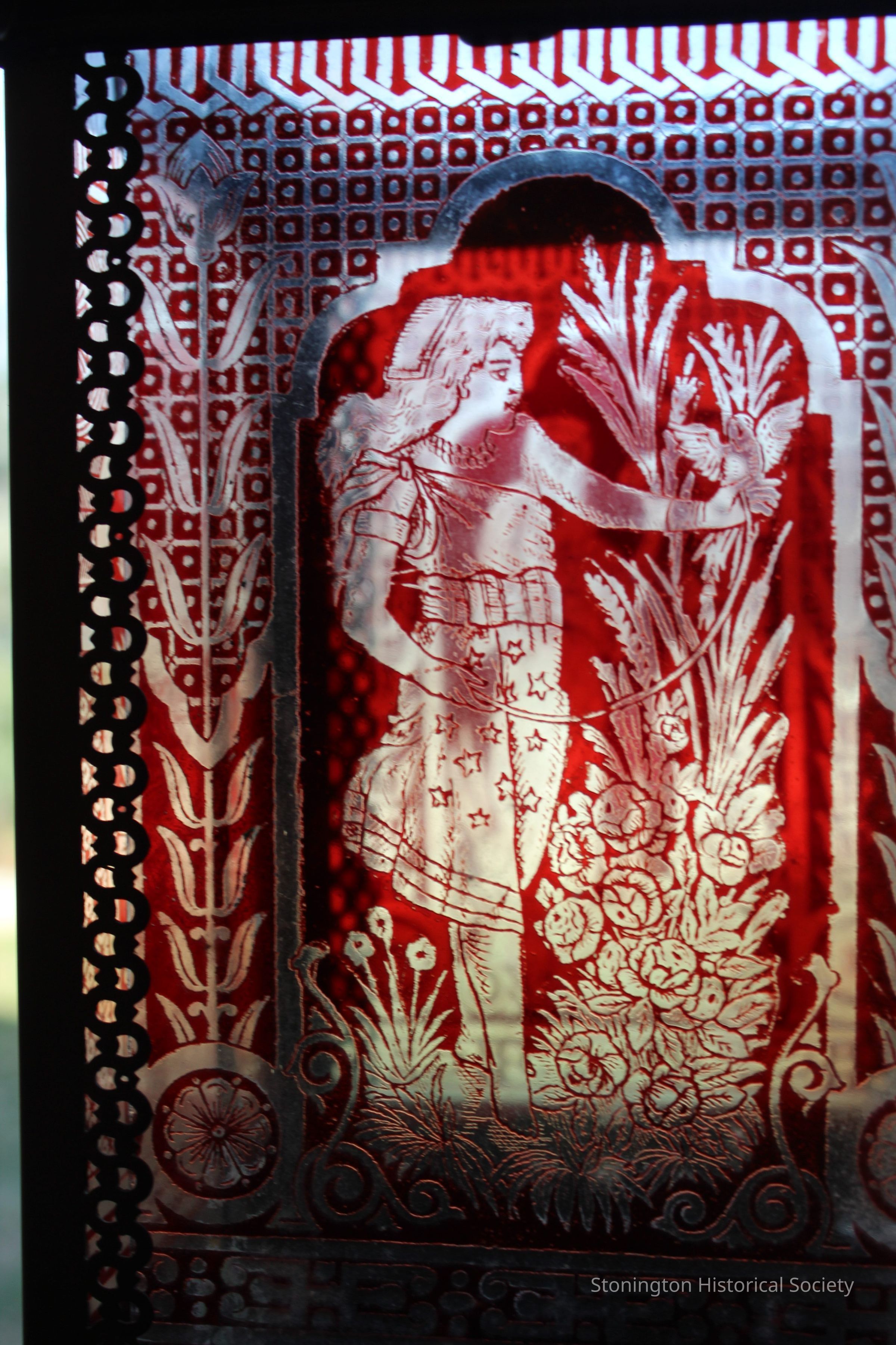 Etched red glass and brass hanging oil lamp. Oil reservoir and chimney are missing, but has been informally wired for electricty. Believed to be original to the house at 85 Water Street.