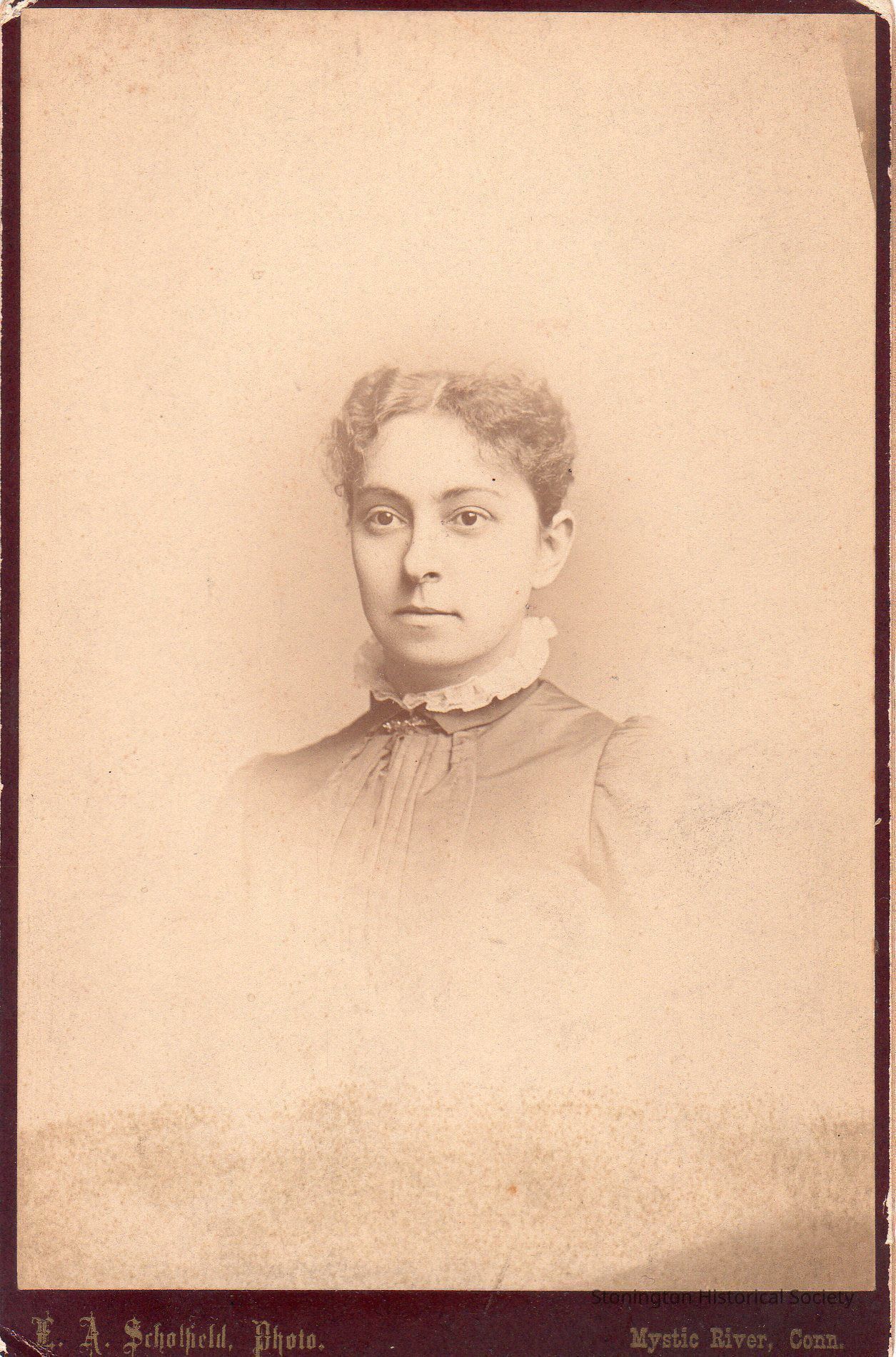 Photograph portrait, mounted on board, of Eunice Avery Fish (1850-1937) taken by Everett Scholfield, Mystic. She was the wife of Walter Fish and lived on Prospect St. in Mystic.Made/Created