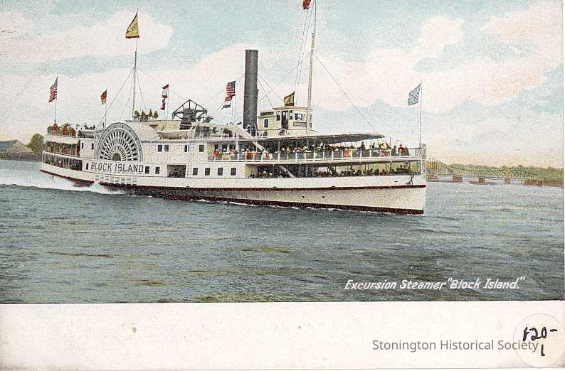 Postcard showing the excursion steamer "Block Island". Newsclipping included about beginnings of postcards